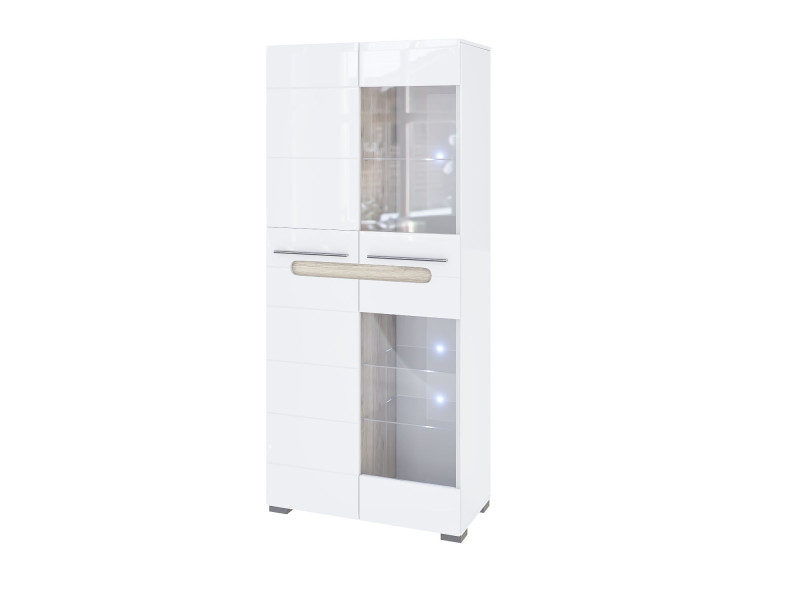Шкаф 2Д Ск Бианко - современный и стильный 2-дверный шкаф модульной системы Бианко производства украинской компании Світ Меблів. Он производится в цвете "белый/ белый глянец, сонома". Такое сочетание цветов наилучшим образом будет смотреться в обстановке комнаты со светлым фоном или в виде контраста в комнате с темным фоном. В сочетании с остальными элементами модульной системы Бианка шкаф изысканно украсит Вашу гостиную комнату и создаст в ней приятную и комфортную обстановку. Состоит шкаф Бианко из стеклянных полочек за дверцей из стекла и полок за дверью из ламинированной ДСП с фасадом МДФ. Он украшен удлиненными ручками.