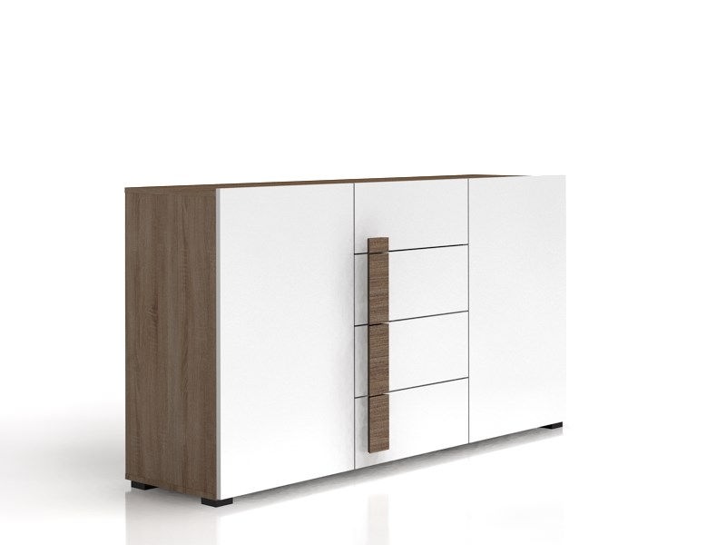 Комод KOM2D4S Доменика - один из новых комодов производства мебельной фабрики Гербор для гостиной, кухни или прихожей. Этот комод изготавливается из современной ДСП в цвете "дуб сонома/ белый глянец" в популярном минималистическом стиле. Он имеет геометрически ровные прямоугольные формы конструкции, фирменную фурнитуру Hettich. Состоит комод Доменика из 2 секций с полками за 2 дверями и 4 ящиков на роликовых направляющих для вещей. Оснащается комод аккуратными деревянными ручками. Комод KOM4D4S Доменика благодаря своей конструкции и цвету гармонично будет смотреться в интерьере помещения как с остальными модулями системы Доменика, так и с мебелью в похожем стиле и цвете.