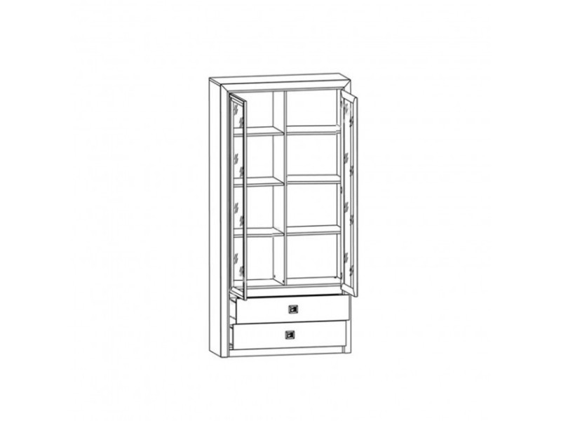 Витрина КОЕН II REG2W2S фабрики БРВ-Украина для гостиной, столовой, домашнего кабинета и офиса. Содержит два выдвижных ящика на роликовых направляющих и два закрытых отделения с тремя полками в каждом. Применяются петли Hettich. Для открывания используются квадратные ручки с орнаментом.