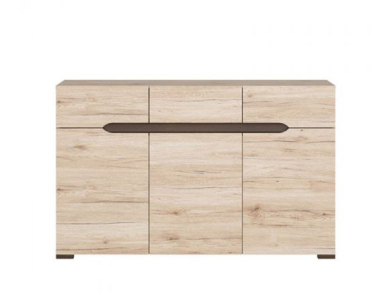 Изготавливается из ДСП с элементами МДФ в цвете «дуб san remo светлый». Привлекает внимание оригинальными углубленными ручками с эффектно контрастирующими вставками в цвете «венге коричневый». Простые геометрические формы смягчены закругленными фасадами. Витрины с тонированным стеклом дополнительно могут комплектоваться подсветкой.
