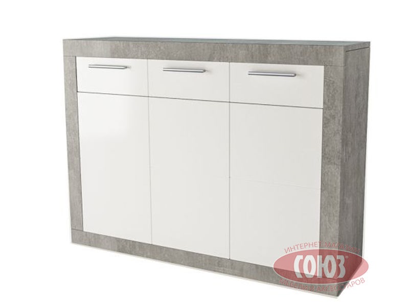 Комод 3Д 3Ш Омега из коллекции модульной мебели Омега украинской фабрики Світ Меблів. Вместительный комод в своей конструкции имеет три выдвижных ящика и три дверки, за которыми полочка. Главными особенностями модели являются простые геометрические формы, практичный и функциональный дизайн, контрастное сочетание цветов. Такая коллекция в стиле хай-тек подойдет любителям современности и минимализма. Разнообразие модулей позволит создать индивидуальный стиль помещения, а цвет корпуса бетон - произвести эффектное впечатление. В ассортимент вошли модули для обустройства гостиной комнаты или холла.