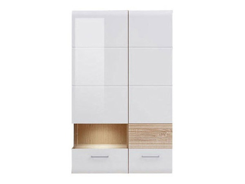 Изготавливается в цвете: белый / белый глянец с декоративными рифлеными планками дуб сонома. Характеризуется оригинальными глянцевыми фасадами, подсвеченными витринами, удобными продолговатыми ручками и квадратными ножками.