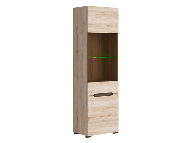 Изготавливается из ДСП с элементами МДФ в цвете «дуб san remo светлый». Привлекает внимание оригинальными углубленными ручками с эффектно контрастирующими вставками в цвете «венге коричневый». Простые геометрические формы смягчены закругленными фасадами. Витрины с тонированным стеклом дополнительно могут комплектоваться подсветкой.