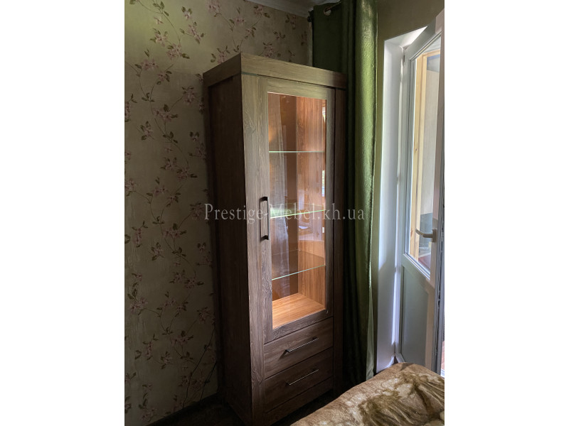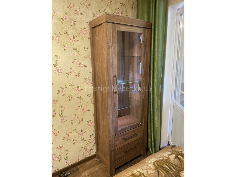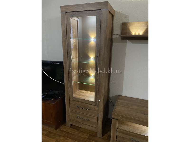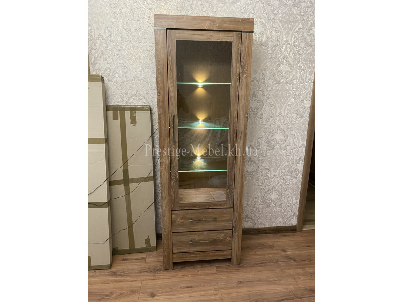 Витрина REG1W2S/20/7 German BRW содержит два выдвижных ящика и одно закрытое отделение с тремя стеклянными полками внутри.