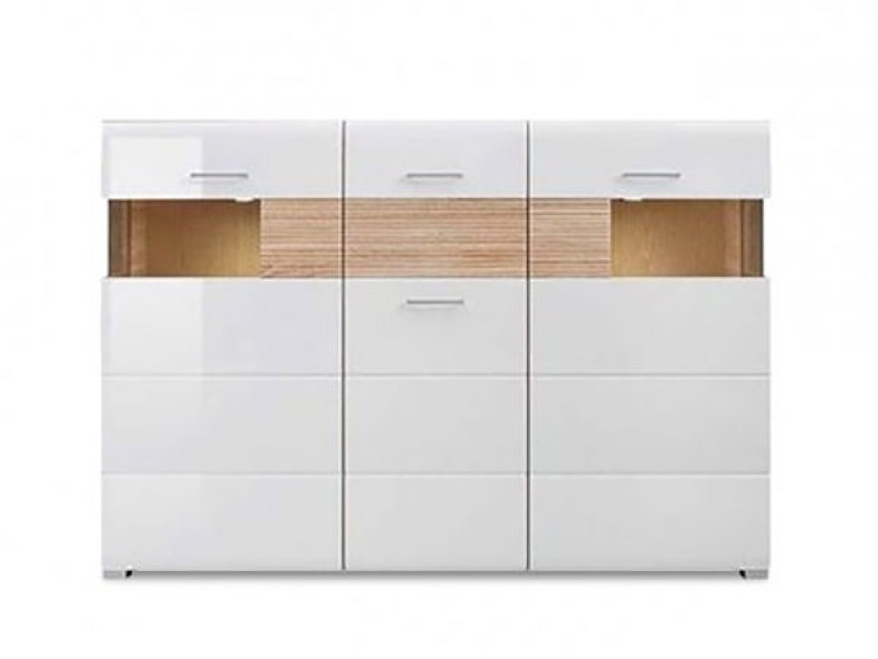 Изготавливается в цвете: белый / белый глянец с декоративными рифлеными планками дуб сонома. Характеризуется оригинальными глянцевыми фасадами, подсвеченными витринами, удобными продолговатыми ручками и квадратными ножками.