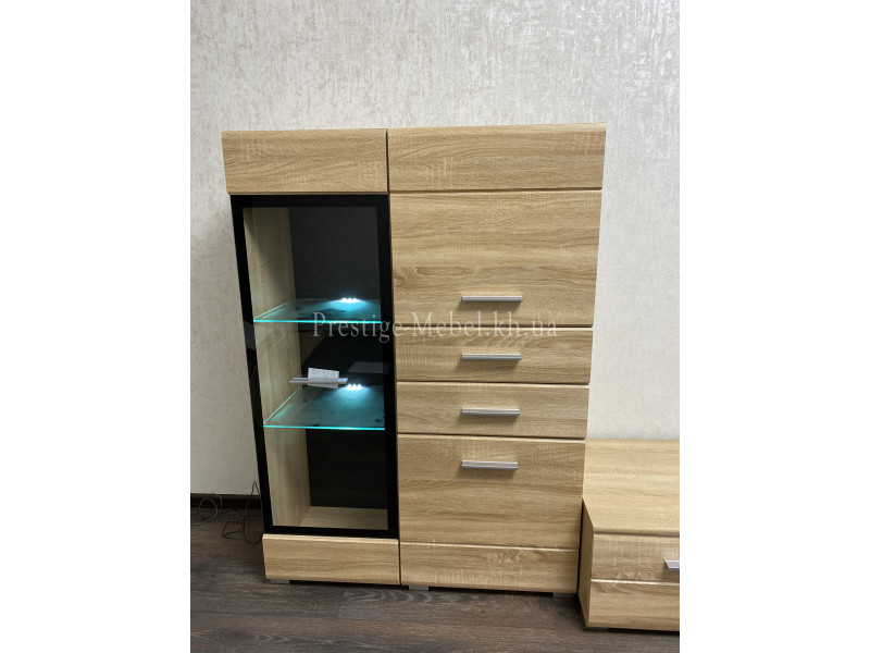 Витрина REG 1W2D2S 13/9 L/P Вушер - современная стильная витрина украинского производителя, которая ничем не уступает зарубежным аналогам. Она изготовлена в светлом цвете "дуб сонома", подойдет для светлого интерьера помещения. Разделена витрина на 2 функциональных отделения: стеклянная витрина на 3 полочки с подсветкой (для хранения посуды, фоторамок и др) и закрытое: с наличием ящиков и мини-шкафчиков для хранения вещей. Эта витрина будет идеально сочетаться в интерьере с пеналом и другими элементами с подсветкой. Вместе они создадут гармоничный интерьер в Вашем помещении. Задняя стенка стеклянного отделения выполнена в контрастном цвете "черный глянец", который придает шарма и элегантности мебели Вушер.