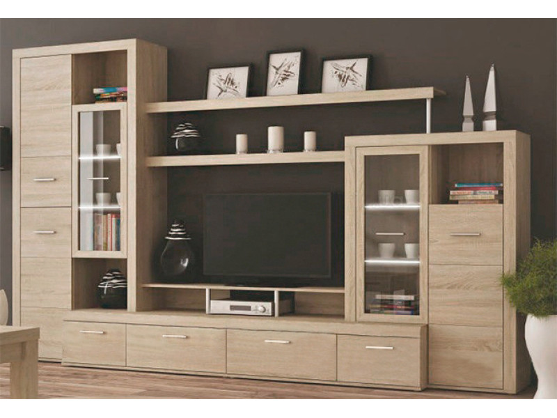 Состоит гостиная Лион из ТВ-тумбы с надставкой, двух витрин и двух полок. Тумба, в свою очередь, имеет несколько ящиков для хранения вещей. Витрины оснащены закрытыми и открытыми полками. Все элементы оснащены надежной современной фурнитурой, ящики имеют роликовые направляющие. Грамотная компоновка гостиной Лион позволит разместить ее в помещении среднего и большого размера в сочетании с мебелью в похожем стиле и цвете.