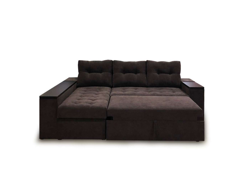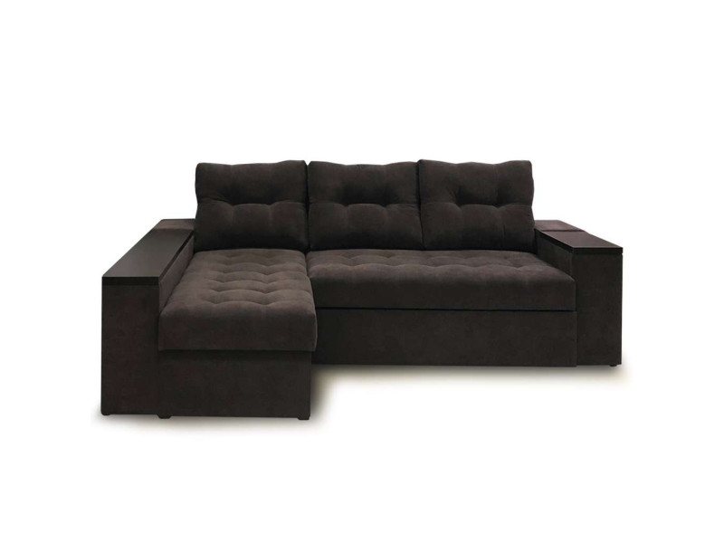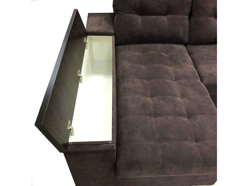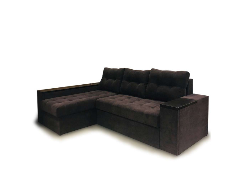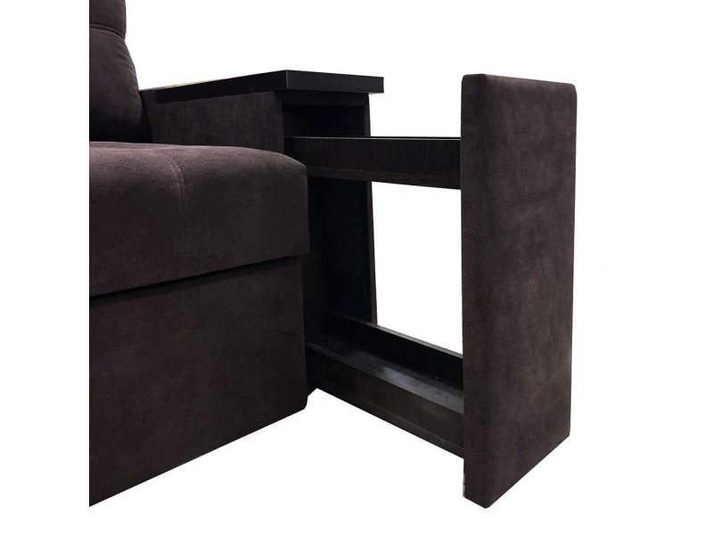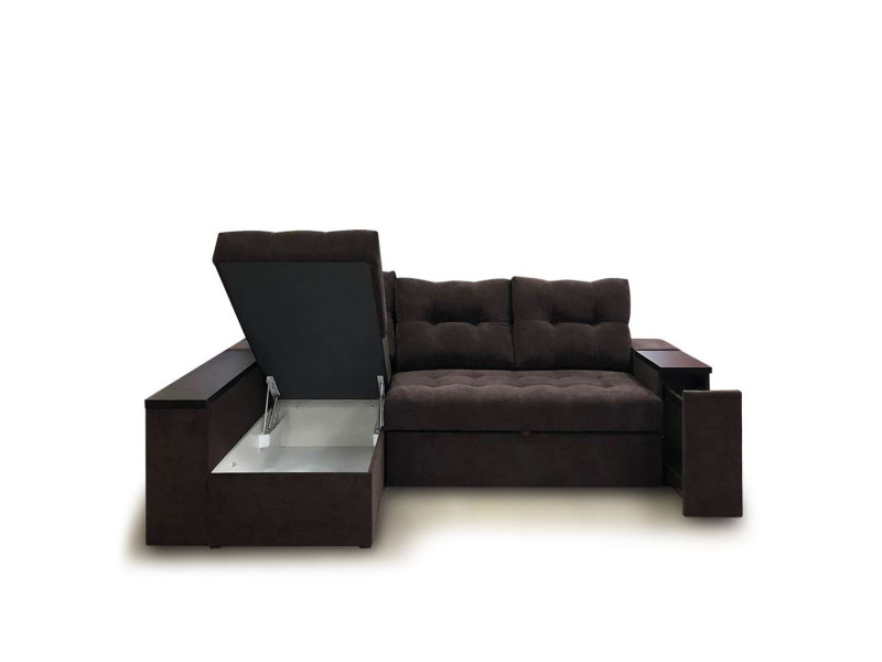 Угловой диван Лидер Люкс имеет большой короб для белья под сидением. Подлокотник углового сегмента также предусматривает в своей конструкции дополнительную нишу. Во втором подлокотнике размещён выкатной бар.