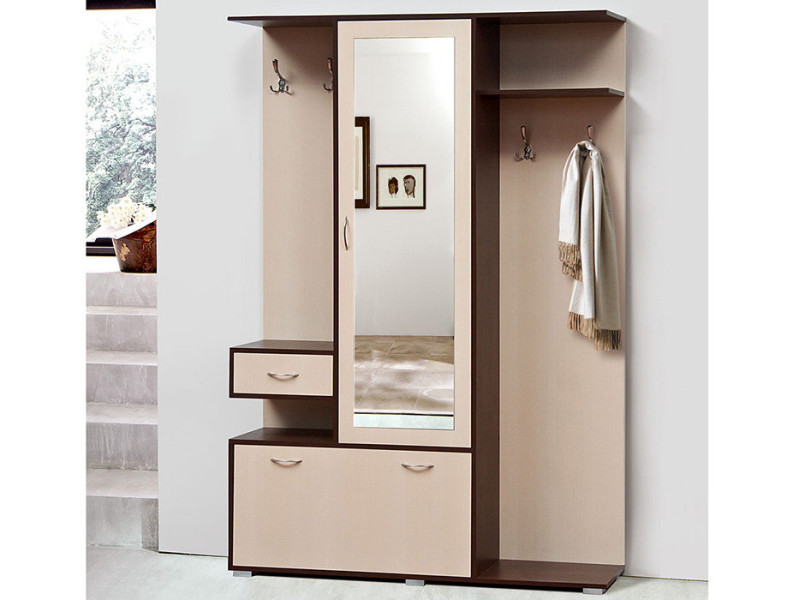 Прихожая ГРЕТА СВІТ МЕБЛІВ – практичный комплект в прихожую Greta Svit Mebliv от фабрики «Мир мебели – Украина». Изготавливается в двух цветовых решениях: венге светлый / венге темный и дуб сонома / белый. Состоит из платяного шкафа с зеркалом на фасаде, однодверной тумбы для обуви, ниши, выдвижного ящика, двух открытых отделений с крючками для одежды и полки для головных уборов. Размеры: шир./выс./гл. – 140/202,5/37 см. Прихожая Грета Свит Меблив характеризуется минималистическим дизайном, компактностью, модным цветовым сочетанием и удобными продолговатыми ручками. Продается комплектом.