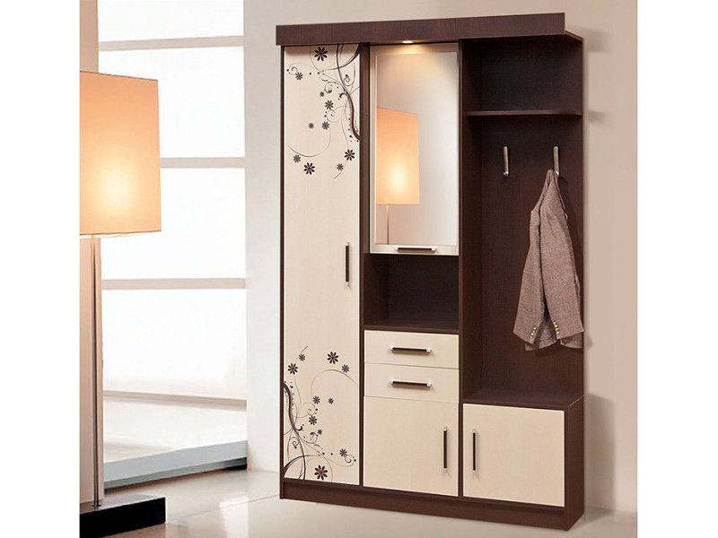 Прихожая СИЛУЭТ 1 СВІТ МЕБЛІВ – практичный комплект в прихожую Siluet 1 Svit Mebliv от фабрики «Мир мебели – Украина». Изготавливается в цвете: венге светлый / венге темный. Состоит из однодверного платяного шкафа, небольшого двухдверного пенала с зеркальной верхней дверью, двумя выдвижными ящиками и нишей, однодверной тумбы для обуви, панели с двумя крючками и полкой для головных уборов. Комплектуется подсветкой. Размеры: шир./выс./гл. – 130/208,5/47 см. Прихожая Силует 1 Свит Меблив характеризуется стильным дизайном с четкими правильными линиями, декоративным орнаментом на фасадах, модным цветовым сочетанием и удобными продолговатыми ручками. Продается комплектом.