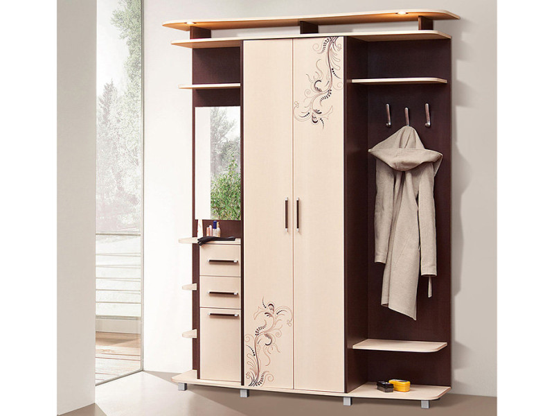 Прихожая СИЛУЭТ 3 СВІТ МЕБЛІВ – практичный комплект в прихожую Siluet 3 Svit Mebliv от фабрики «Мир мебели – Украина». Изготавливается в цвете: венге светлый / венге темный. Состоит из двухдверного платяного шкафа, однодверной тумбы с двумя выдвижными ящиками и двумя открытыми полками, боковых панелей с зеркалом, тремя крючками и тремя полками. Комплектуется подсветкой. Размеры: шир./выс./гл. – 170/214,5/46,5 см. Прихожая Силует 3 Свит Меблив характеризуется стильным дизайном с четкими правильными линиями, декоративным орнаментом на фасадах, модным цветовым сочетанием и удобными продолговатыми ручками. Продается комплектом.
