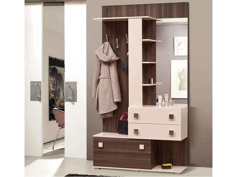 Прихожая СОНАТА СВІТ МЕБЛІВ – практичный комплект в прихожую Sonata Svit Mebliv от фабрики «Мир мебели – Украина». Изготавливается в цвете: дуб борас / венге светлый. Состоит из тумбы для обуви с откидной дверцей, двух выдвижных ящиков, одного открытого отделения, панели с зеркалом, тремя крючками, полкой для головных уборов и тремя небольшими полочками для мелочей. Размеры: шир./выс./гл. – 120/222,5/40,5 см. Прихожая Соната Свит Меблив характеризуется оригинальным дизайном, компактностью, удобными квадратными ручками, практичностью и функциональностью. Продается комплектом.