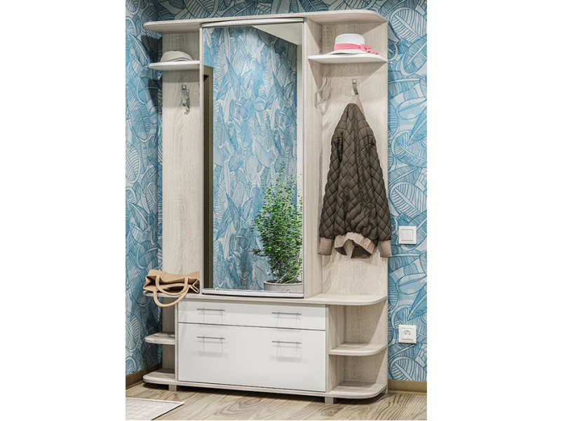Прихожая ПРИМА СВІТ МЕБЛІВ – практичный комплект в прихожую Prima Svit Mebliv от фабрики «Мир мебели – Украина». Изготавливается в двух цветовых решениях: венге светлый / венге темный и дуб сонома / белый. Состоит из платяного шкафа с зеркалом на фасаде и однодверной тумбы для обуви с выдвижным ящиком по центру. По бокам расположены открытые отделения с крючками для одежды и полками. Размеры: шир./выс./гл. – 135/211/40,5 см. Прихожая Пріма Свит Меблив характеризуется оригинальным дизайном с зеркальной поворотной дверью, визуально расширяющей пространство. Продается комплектом.