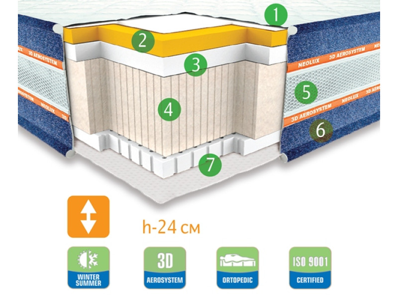 7. 3D Aerosystem - уникальная система микроклимата. Особенностью конструкции является трехмерная аэролента, интегрированная в борт матраса по всему периметру. Система позволяет воздуху и влаге, проходя сквозь настилочные слои матраса, беспрепятственно выходить из него во всех направлениях.