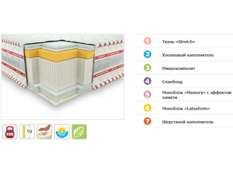 | Наполнение | Latexform, Пена памяти, Шерсть, Хлопок, Микрокомпозит, Спанбонд |
