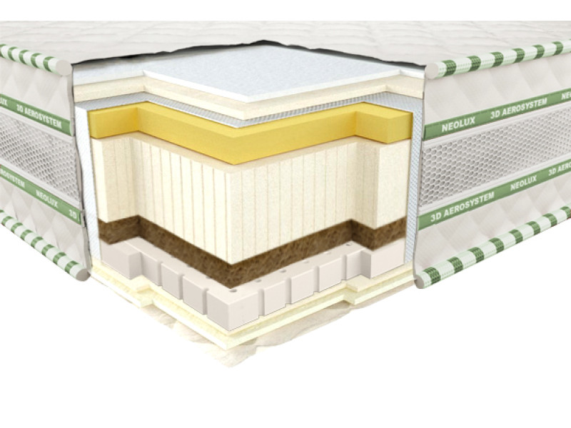 Беспружинный ортопедический матрас NEOFLEX COMFO 3D на основе инновационных материалов Memory, натурального латекса, латексированной кокосовой койры и основы из материала Latexform. Сочетание латекса и кокосовой койры с «летней» стороны и вязкоэластичного материала Memory c «зимней» стороны, способствует здоровому отдыху, а различная жесткость сторон матраса выбирается соответственно вашим предпочтениям. Основа «Latexform» отлично поддерживает контуры тела, обеспечивая поддержку там, где это действительно необходимо. Особенностью и уникальной частью конструкции является 3D Aerosystem, которая состоит из множества переплетенных между собой волокон, что позволяет беспрепятственно циркулировать воздуху и влаге. Чехол матраса выполнен в новейшей трикотажной ткани Dream Health, обладающей высокой эластичностью, износостойкостью и эффектом «зима-лето».
