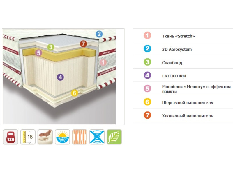 | Наполнение | Latexform, Пена памяти, Шерсть, Хлопок, Спанбонд |