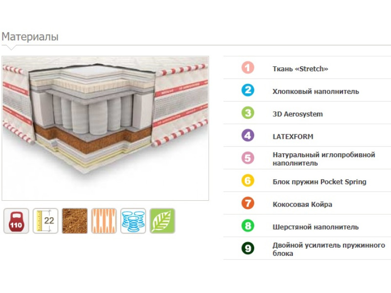 | Наполнение | Latexform, Кокосовая койра, Шерсть, Хлопок, Термоволокно, Натуральный иглопробивной наполнитель |