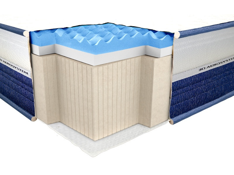 6. 3D Aerosystem - уникальная система микроклимата. Особенностью конструкции является трехмерная аэролента, интегрированная в борт матраса по всему периметру. Система позволяет воздуху и влаге, проходя сквозь настилочные слои матраса, беспрепятственно выходить из него во всех направлениях.