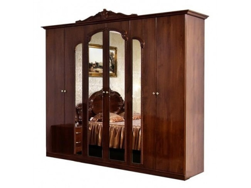 Шкаф 6Д Империя - большой 6-дверный шкаф для верхней одежды и вещей от производителя Світ Меблів, который является функциональным элементом модульной спальни Империя. Этот шкаф необычен и оригинален, он имеет 3 секции для верхней одежды, 3 полки для головных уборов и 4 полки для вещей. 4 двери этого шкафа имеют внешние зеркала. Шкаф украшен витым карнизом, который придает ему изысканность в конструкции и декоративными накладками на фасад. Производится этот шкаф в 2 цветах на выбор: орех лак и роза лак. Благодаря такой цветовой гамме Вы сможете установить шкаф в спальне как с темным, так и со светлым фоном. Материал корпуса и фасада: ДСП и МДФ.Если Вы хотите купить шкаф Империя, звоните в интернет-магазин Престиж мебель.