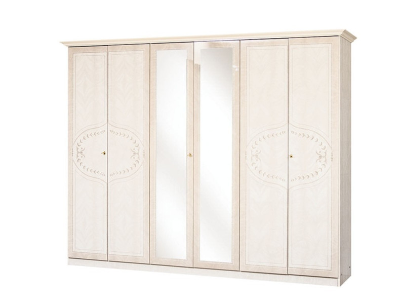 Шкаф 6Д Опера производства мебельной фабрики Світ Меблів - современный 6- дверный шкаф в классическом стиле и 2 цветах на Ваш выбор: роза, орех. Этот шкаф одинаково гармонично будет смотреться как в светлом, так и в темном интерьере спальни. Производится он из высококачественной ДСП с фасадом МДФ на современном оборудовании с использованием иностранной фурнитуры, благодаря чему Вы будете пользоваться им в течении долгого времени. Состоит этот невероятно вместительный шкаф из 3 секций для размещения верхней одежды, полок для вещей и секции для головных уборов. Фасад шкафа украшен рисунком, а центральные двери - зеркалами. Это изделие изысканно, и в то же время непритязательно, украсит Вашу спальню в сочетании с остальными элементами модульной спальни Опера. Если Вы хотите купить шкаф 6Д, звоните в магазин Престиж мебель.